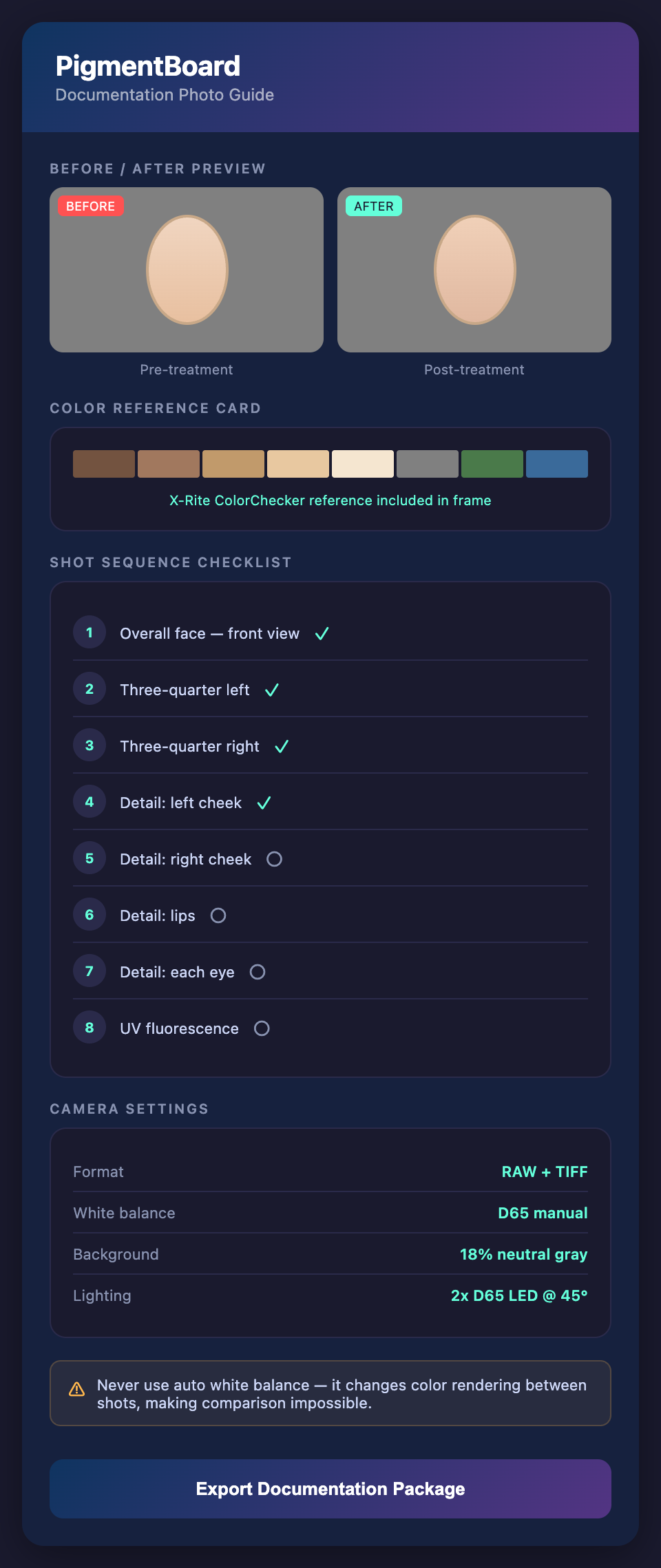 After treatment: Repeat the exact same sequence. Same camera position, same lighting, same background, same framing. The only difference should be the treatment itself.