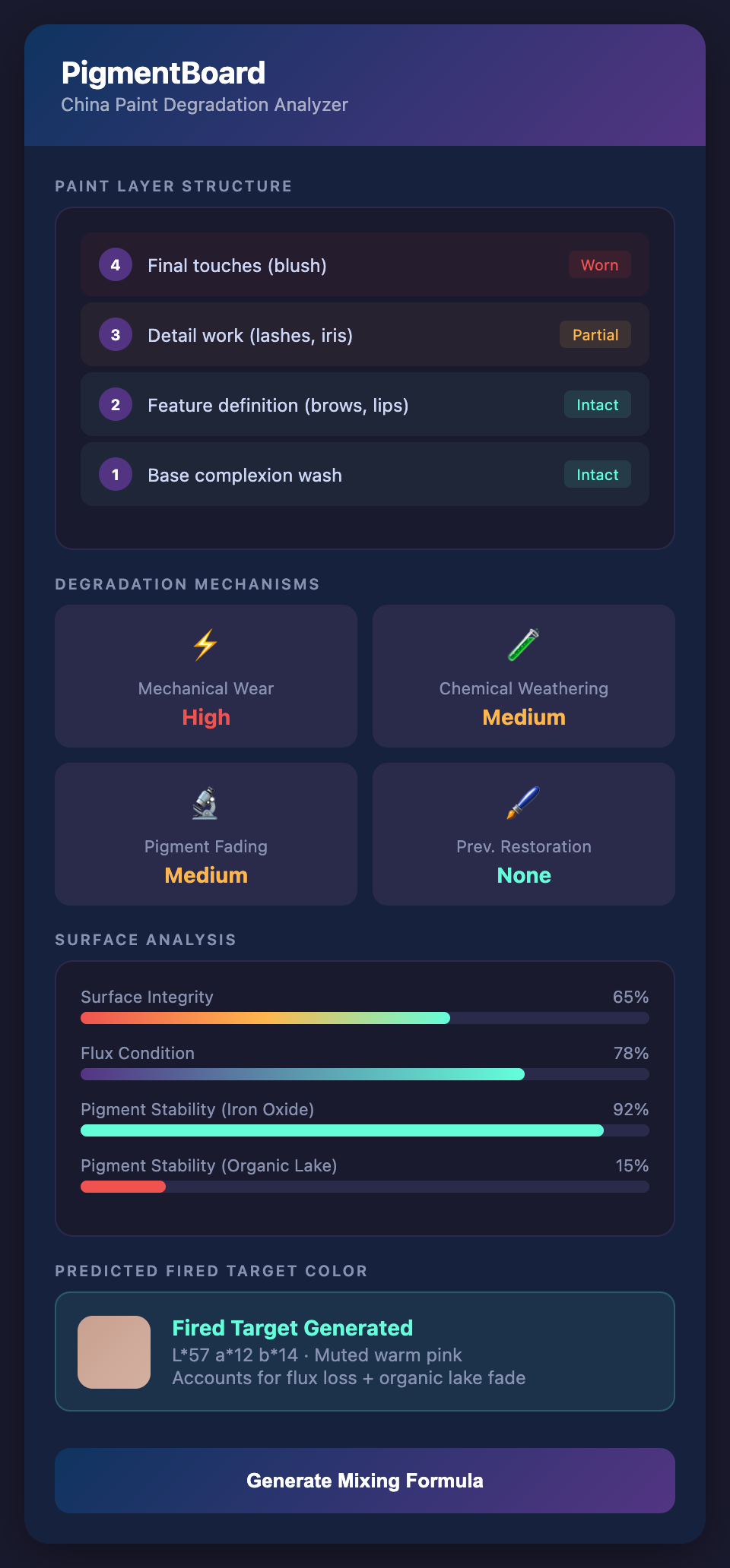 China paint changes color dramatically during firing. Your unfired mixture will look completely different from the fired result. A degradation model that predicts the fired target color eliminates the iterative fire-compare-adjust cycle.