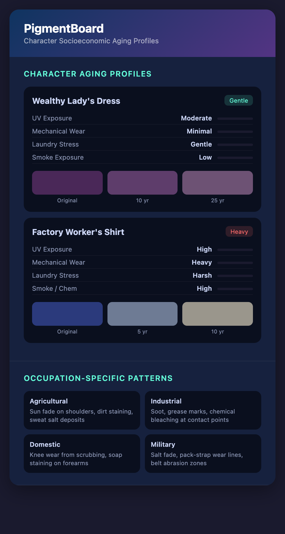 • Factory worker's shirt: UV=high (outdoor breaks), humidity=moderate, wear=heavy, laundry=harsh, smoke=high, chemicals=occupation-specific