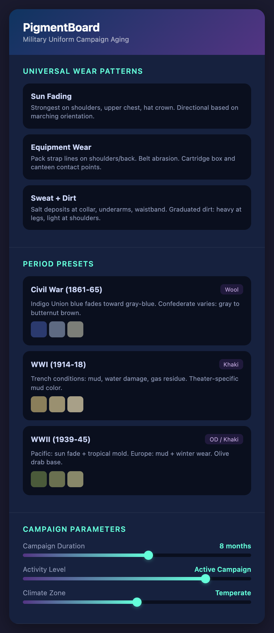 Want to model campaign-specific military uniform aging? Join the PigmentBoard waitlist.
