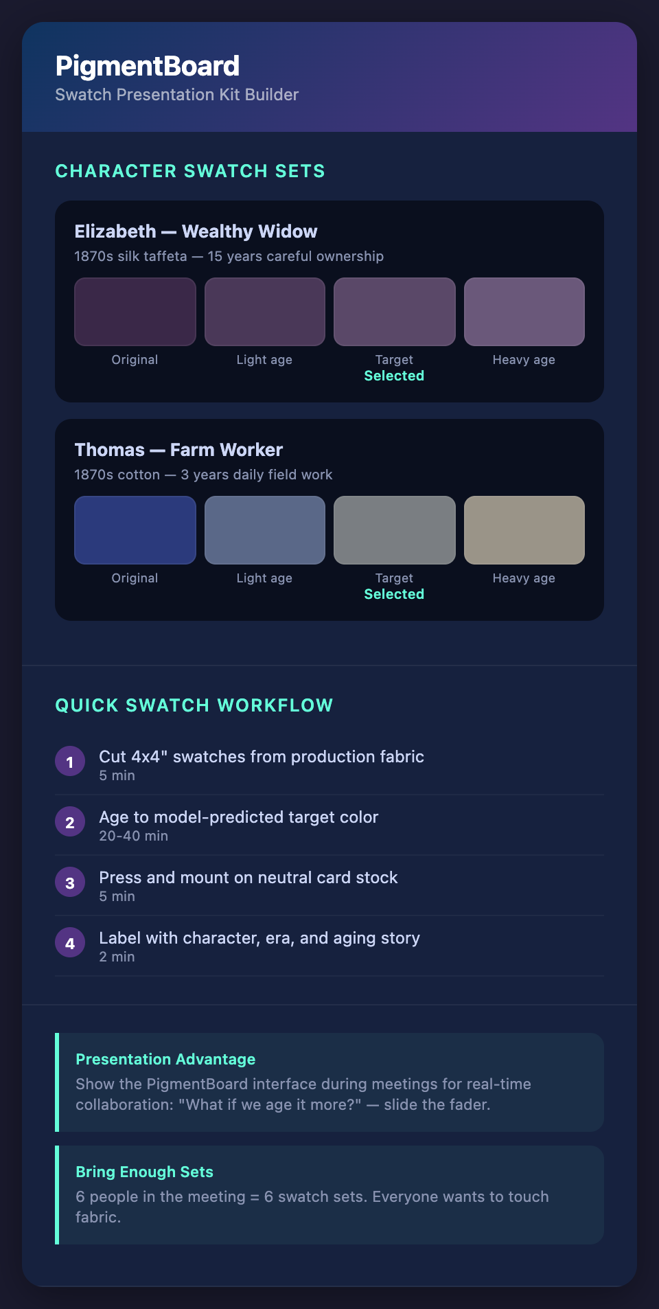 When a costume designer presents their concept to the director, producer, or production meeting, physical fabric swatches are far more persuasive than photographs or verbal descriptions. A 4x4-inch swatch of authentically aged fabric communicates color, texture, weight, drape, and character simultaneously.