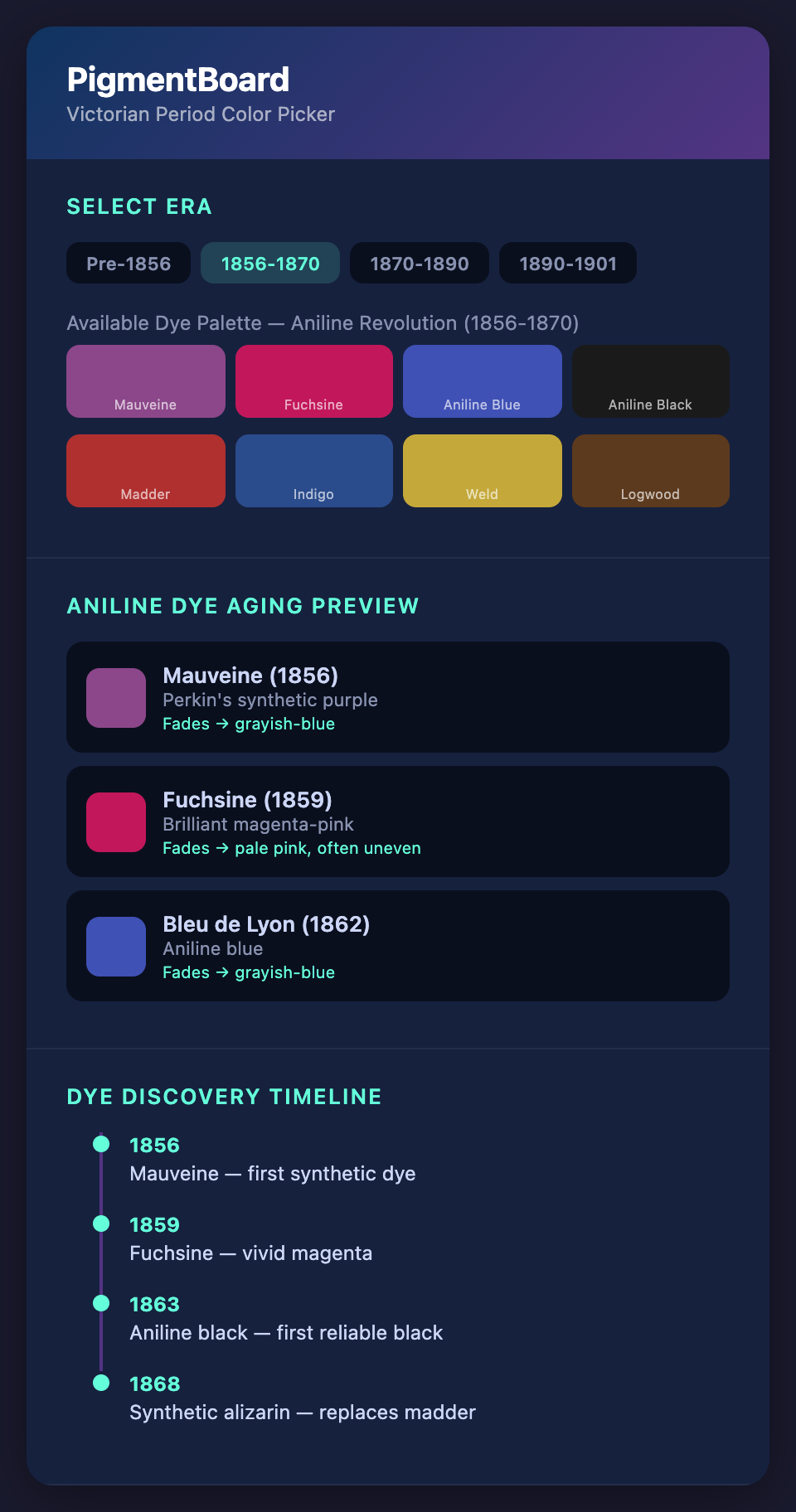 The Victorian era (1837-1901) saw the most dramatic transformation in textile dye history. In 1837, every dye was natural. By 1901, the palette was overwhelmingly synthetic. Costume designers who treat "Victorian" as a single color period are making a historical error.
