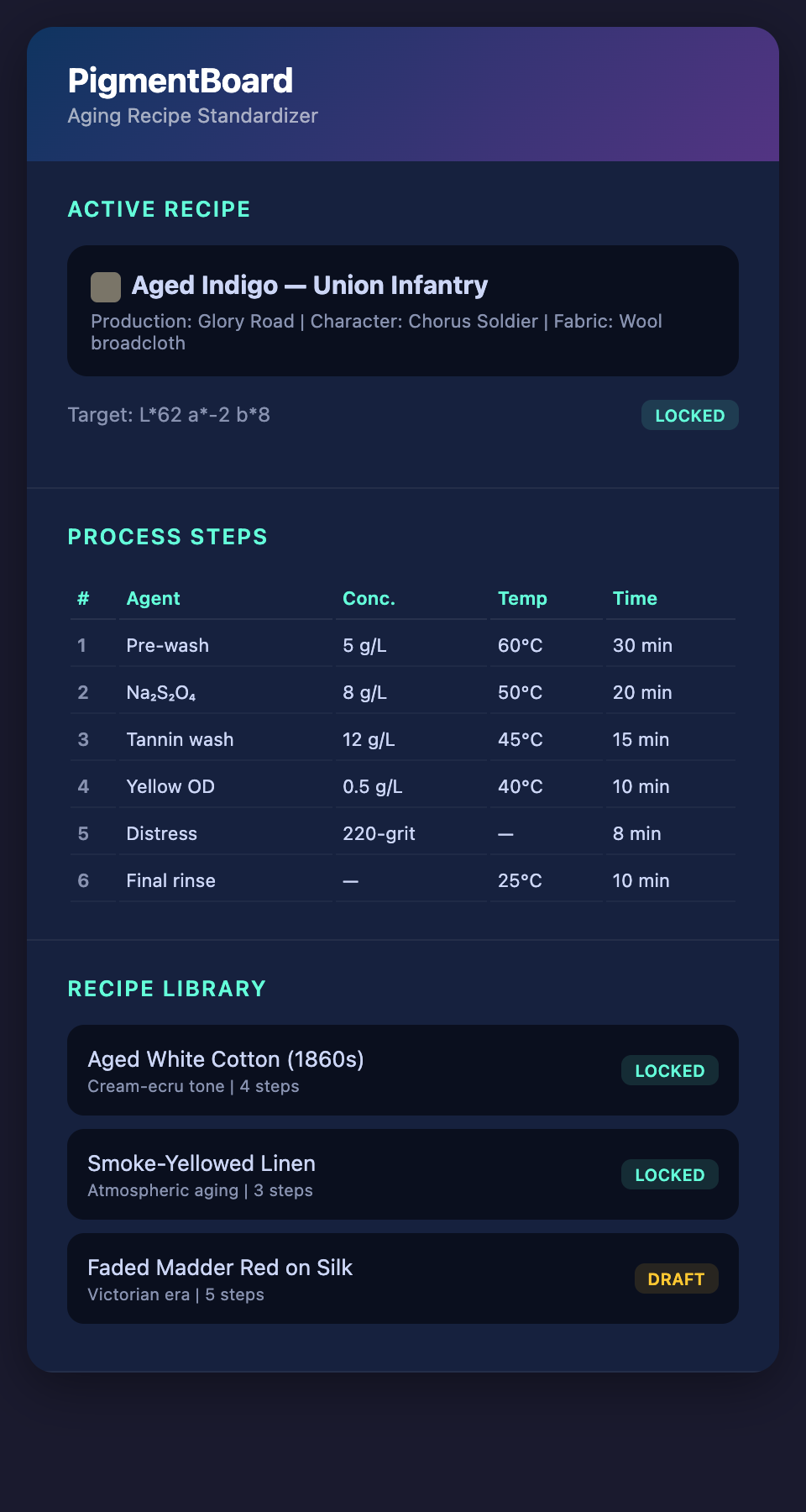 - "Standard aged white cotton (1860s)" becomes a base recipe adaptable to multiple Civil War productions