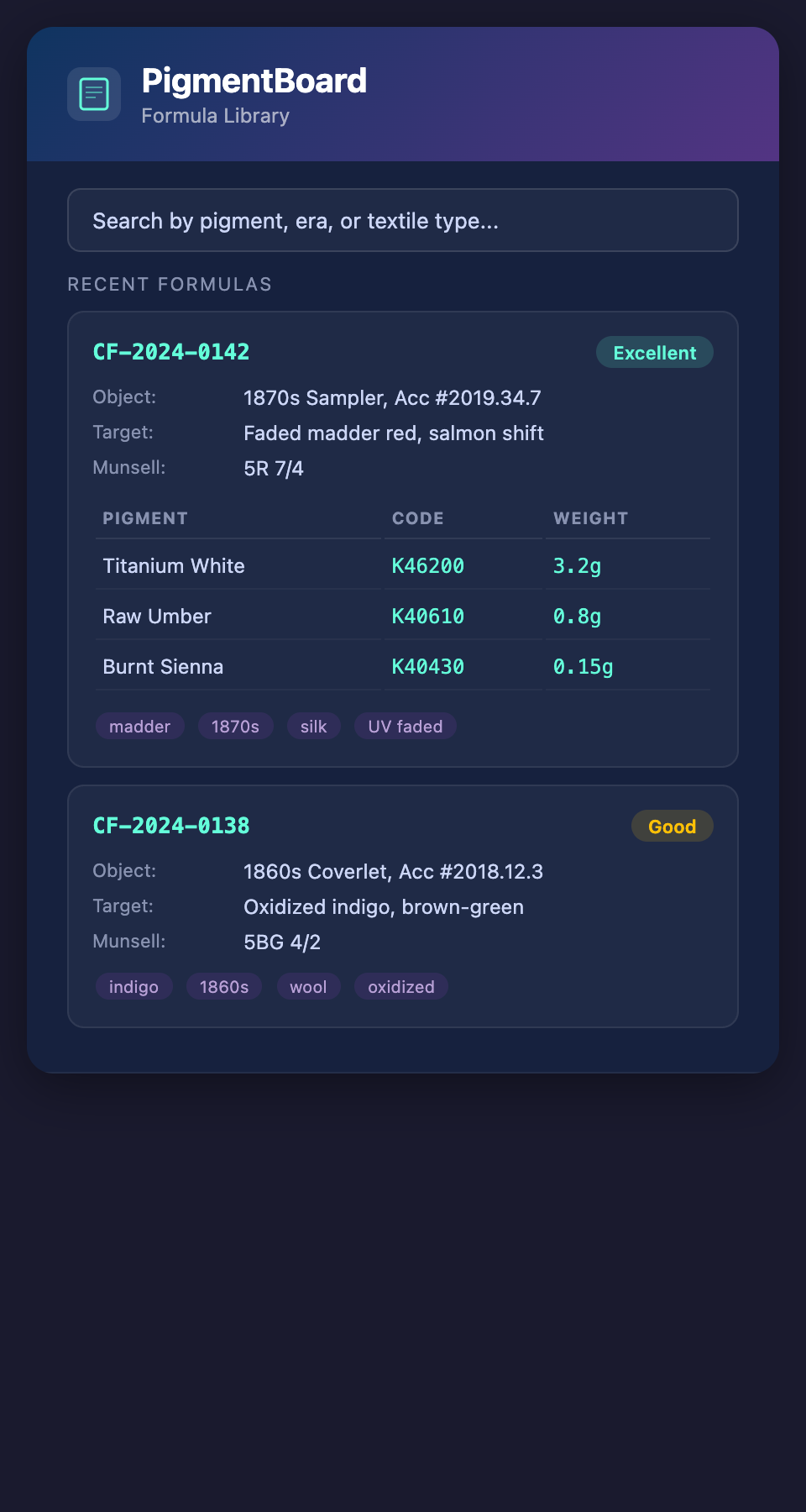 4. Searchable. When a new project requires matching a similar textile, you need to find the relevant formula quickly. This means tagging formulas by dye type, era, fiber type, degradation type, and any other relevant category.