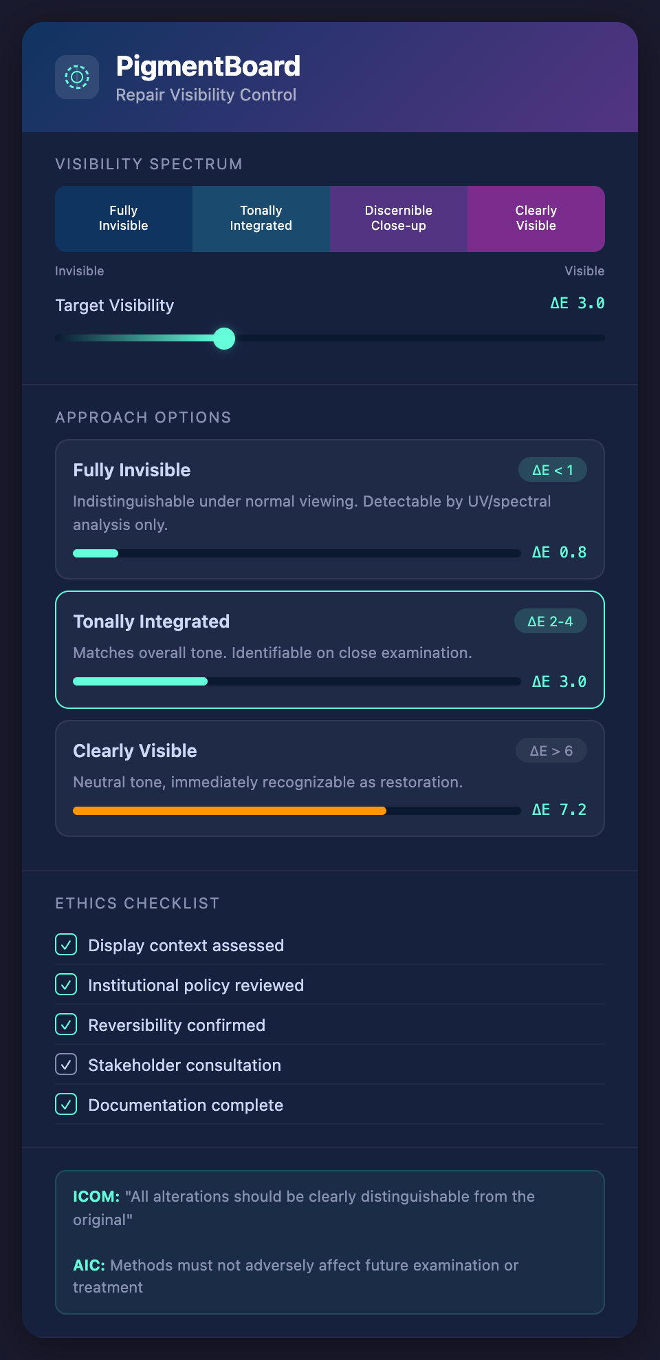Graduated visibility. With precise color control, conservators can choose exactly where on the visibility spectrum to place their repair. Rather than "as close as I could get" (which might be too visible or accidentally invisible), the conservator can deliberately set the repair at, say, ΔE 3 — visible on close inspection but integrated at normal distance.