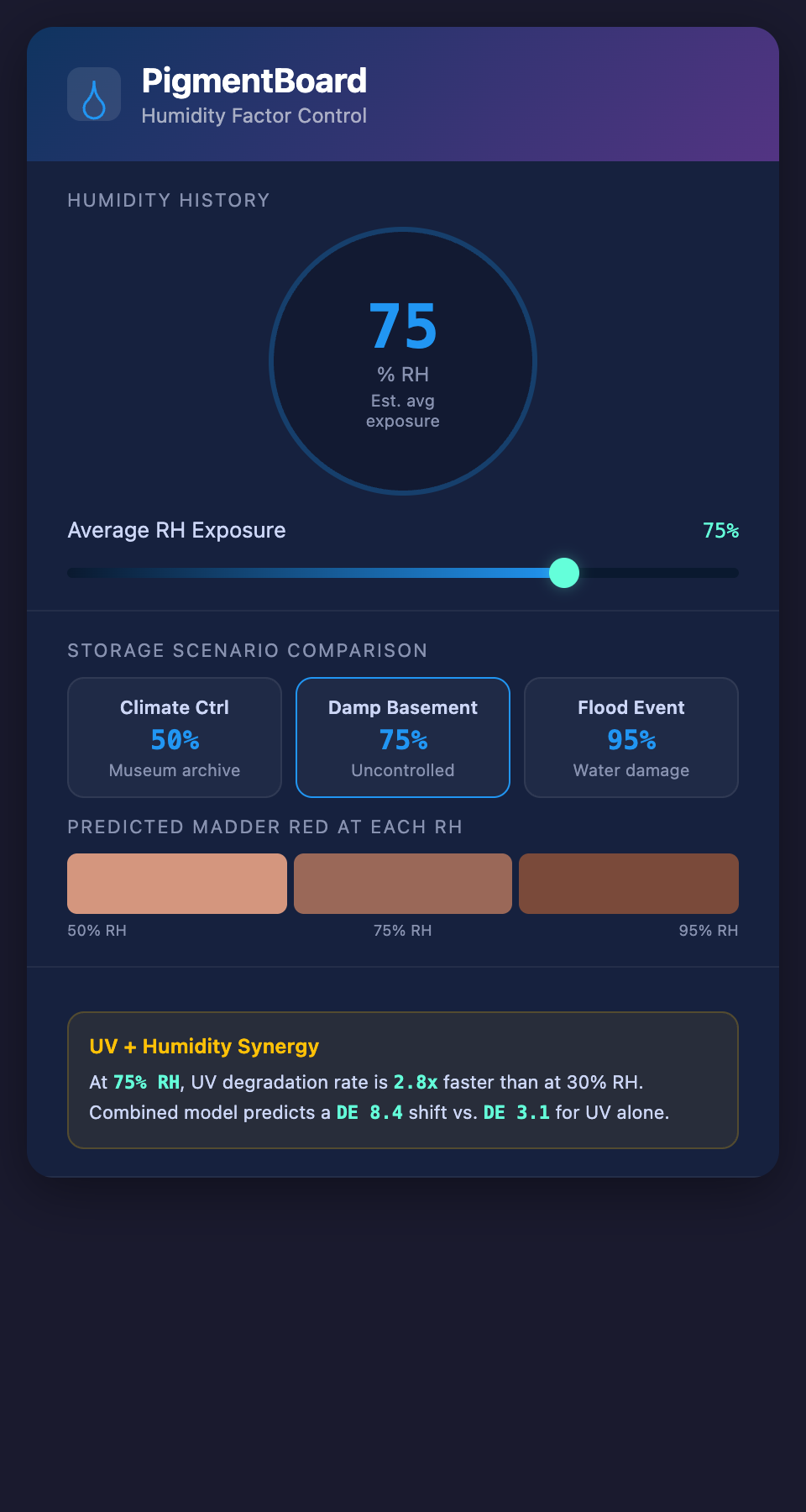 But humidity is not just a storage condition to be controlled. It is an active degradation agent that changes pigment chemistry in specific, predictable ways — ways that differ from UV damage and that must be accounted for separately when matching degraded colors.