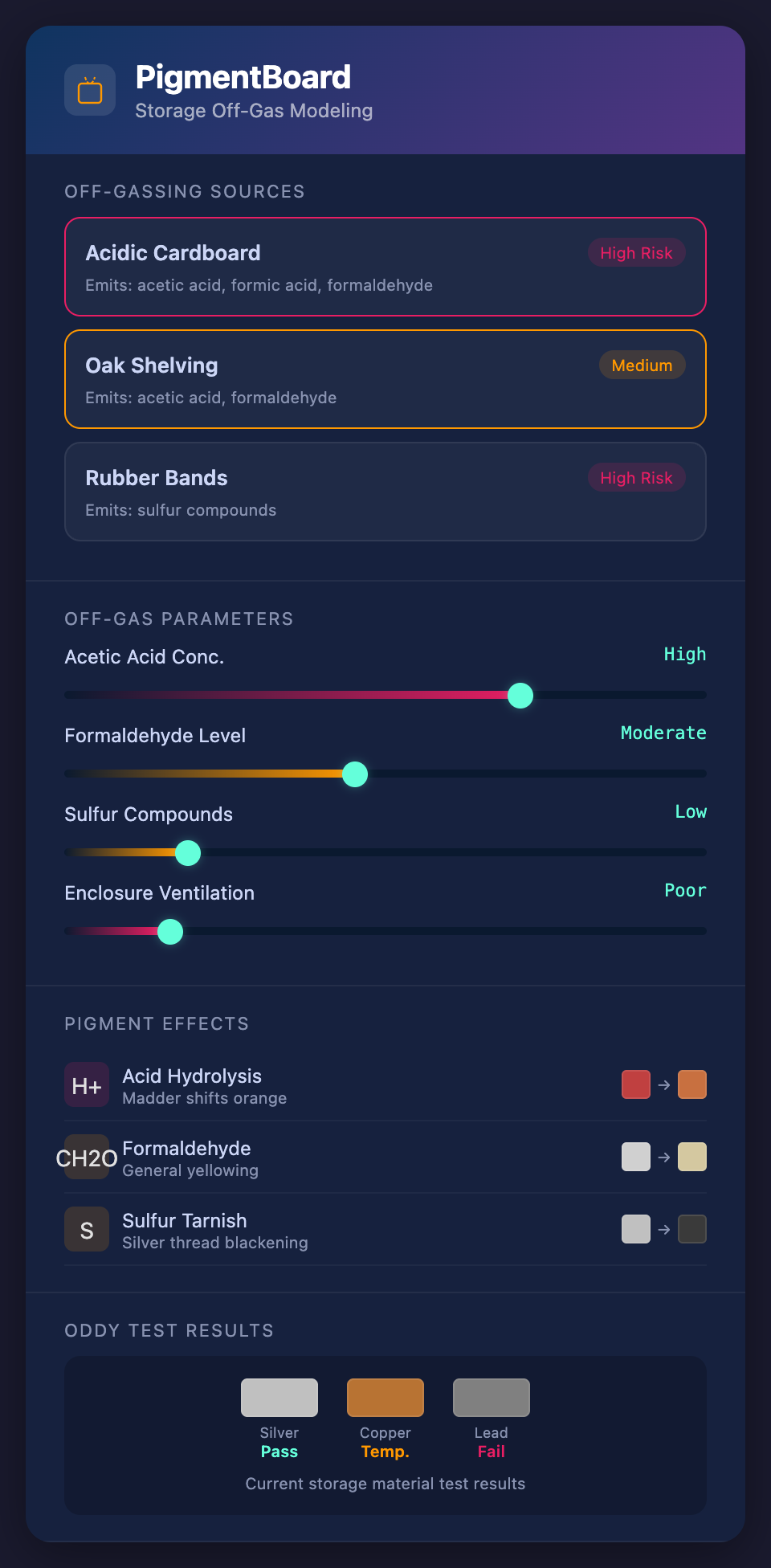 Want to model every degradation factor including storage off-gassing? Join the PigmentBoard waitlist.