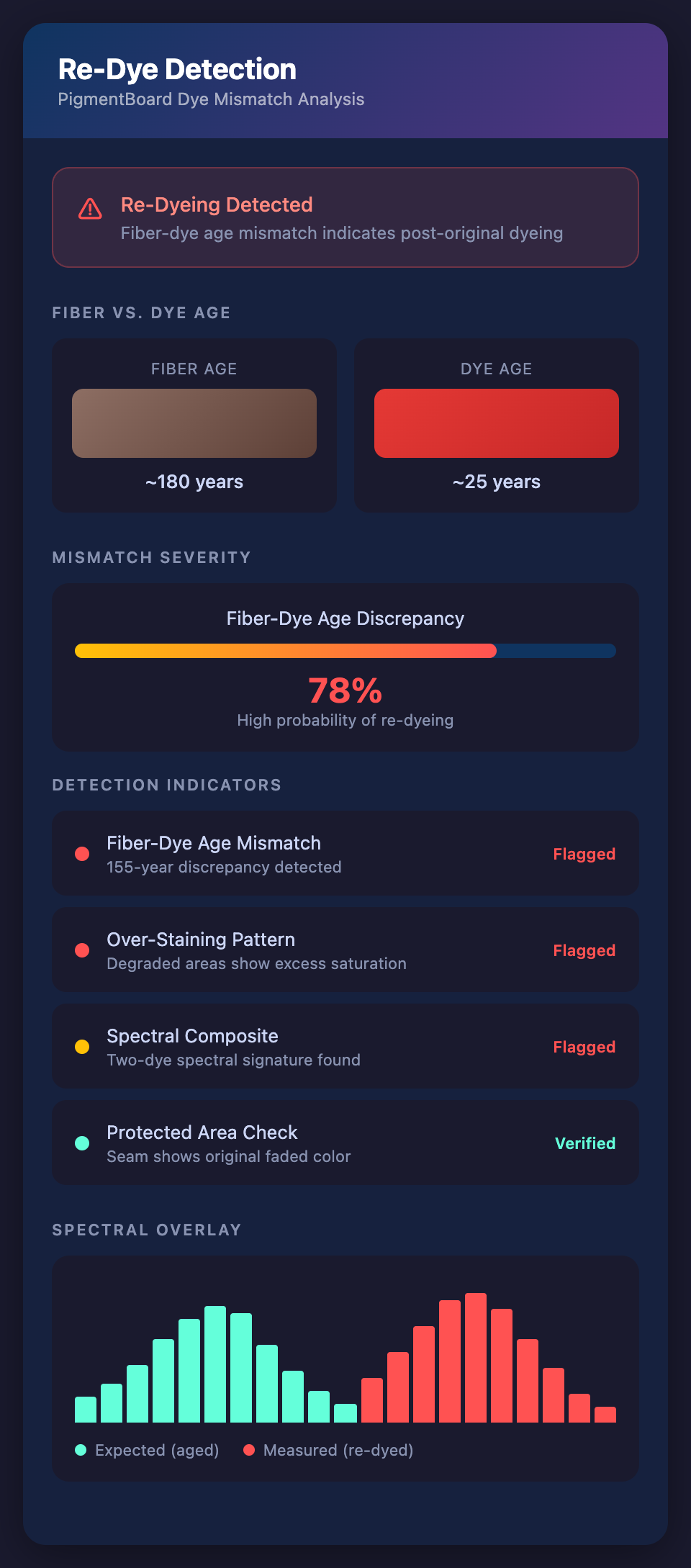 Spectral anomalies. The spectral curve of a re-dyed area shows contributions from both the residual original dye and the new dye. This composite curve may not match any single dye's natural degradation state.