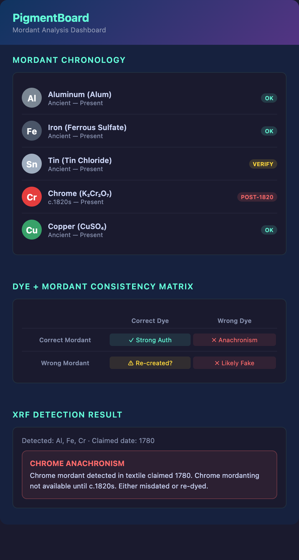 Dating support: If chrome mordant is detected in a textile claimed to be from 1780, the textile is either misdated or the area has been re-dyed.