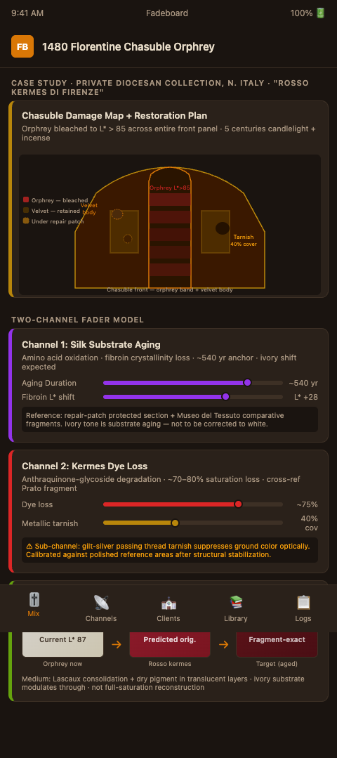 If your studio is working through a comparable high-stakes orphrey restoration and you need a calibrated starting model for kermes or cochineal crimson on aged silk grounds, the Fadeboard team offers session-by-session consultation support. Contact us to discuss how the channel configuration used in this case study can be adapted to your specific piece.