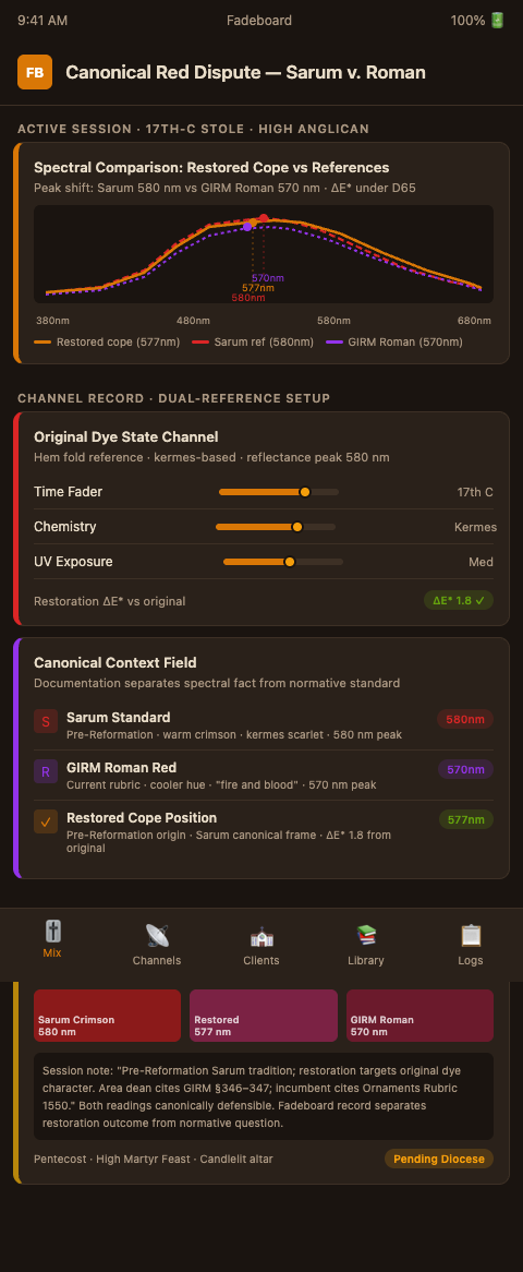 For your next red vestment project where canonical ambiguity exists, open Fadeboard with a dual-reference channel setup — original historical standard and current diocesan standard — document both curves in the session before touching the silk, and submit the output report with your commission letter. The spectral record will protect your professional standing regardless of how the canonical question eventually resolves. Apply to join the Fadeboard waitlist and have this dual-reference framework ready before the next Pentecost or high martyr feast commission requires it.