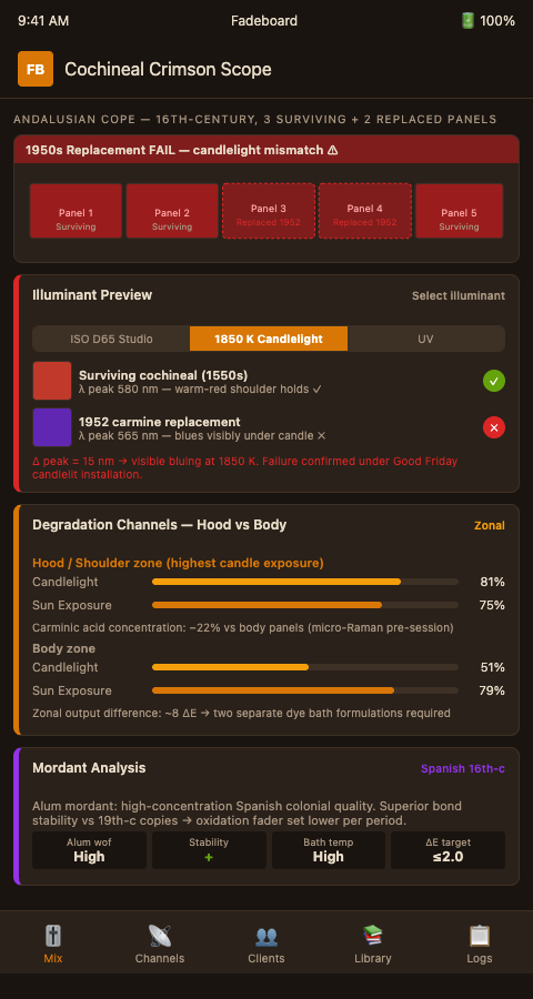 Your surviving 16th-century cope panels carry enough colorimetric information to reconstruct the original cochineal crimson — if you extract that information through a systematic degradation-channel workflow rather than visual matching. Fadeboard converts your panel measurements into a dye-bath specification your Lyon silk house or Florentine supplier can reproduce. When the replacement panels come back from the dyer, the candlelight test will confirm the match before the cope leaves your studio. That is the standard your diocese should expect.