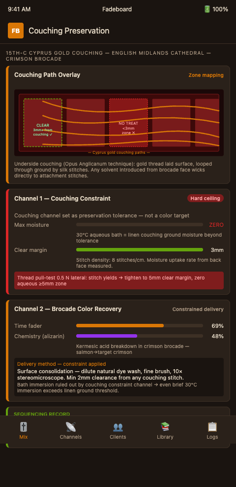 A liturgical cope with intact underside couching and a faded brocade ground is a two-channel problem every time, regardless of how experienced the conservator. The couching constraint is not a nuisance to work around; it is the primary conservation requirement, and the brocade color recovery is secondary. Fadeboard's channel separation makes that priority explicit in the workflow rather than implicit in the conservator's judgment, producing a documented record that the diocesan commission can read as evidence of proper sequencing.