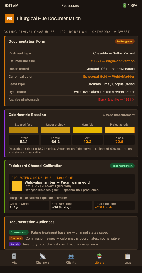 Fadeboard channel calibration. Enter the garment's documented history — manufacture date, liturgical use pattern, storage conditions, known cleaning treatments. The soundboard projects from the current measured state backward through the estimated degradation pathway, arriving at a color reconstruction that represents the most defensible estimate of the original liturgical hue. This reconstruction is expressed as colorimetric coordinates, not a verbal description.