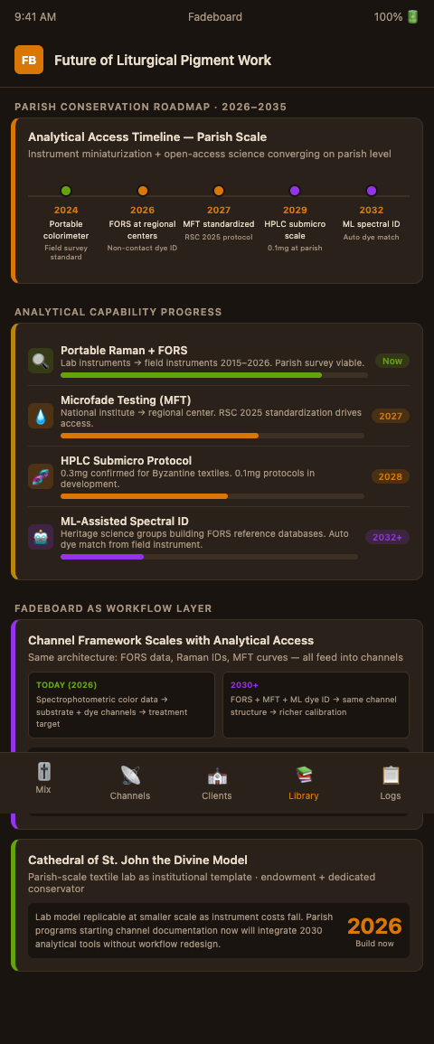Fadeboard's position in the emerging landscape is as the channel framework that makes analytical input actionable and recordable at whatever scale the analytical work is conducted. A parish conservator with access to a regional FORS survey can enter that data into the substrate and dye channels and produce a treatment target and stability record that meets the same documentation standard as a specialist studio session. The channel architecture does not change with scale — it provides the same documented structure for a solo conservator working on a single parish chasuble as for a large metropolitan studio working through a diocesan collection.