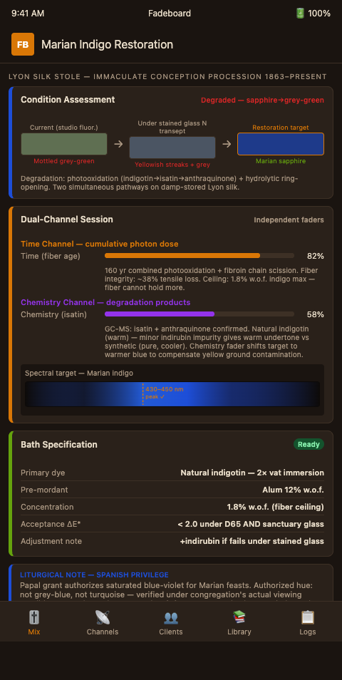 In Fadeboard's interface, the conservator opens the stole session and creates these two faders explicitly. The time fader's midpoint corresponds to the structural fiber condition: a stole at 40% fiber integrity cannot absorb the same dye concentration as one at 80%. The chemistry fader adjusts the spectral model for the measured degradation product mix — more isatin residue shifts the target slightly toward a warmer blue to compensate for the yellow ground contamination. Adjusting one fader while holding the other fixed lets you isolate which variable is constraining your match, rather than trimming both simultaneously and losing the diagnostic record.