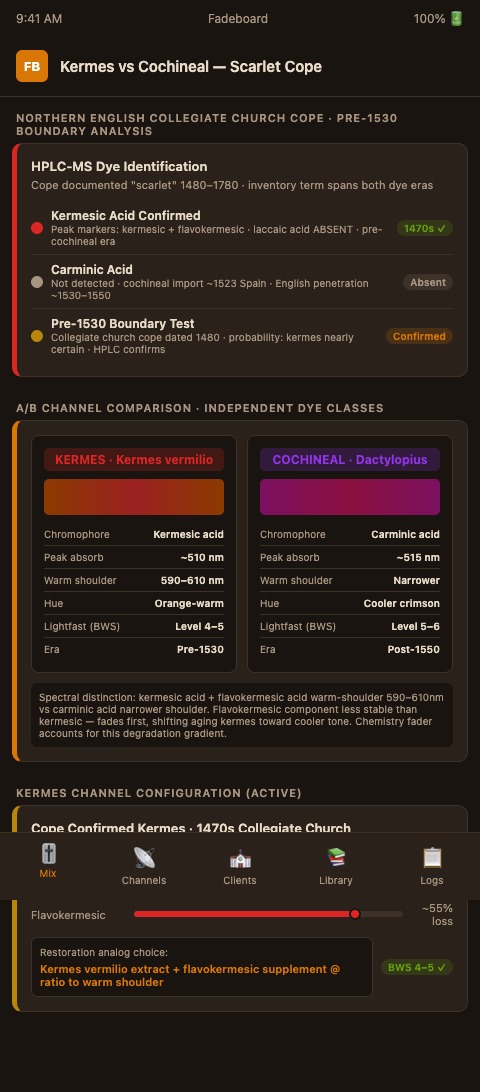 Kermes and cochineal are not interchangeable restoration options for a historic scarlet cope. They are chemically distinct, spectrally distinct, and historically distinct — and getting the identification wrong means restoring a 1470s kermes cope with cochineal, which is not only technically incorrect but historically misleading. Fadeboard's independent channel structure ensures that once the dye class is analytically confirmed, the channel calibration, the bath specification, and the institutional documentation all align with the correct dye identity.