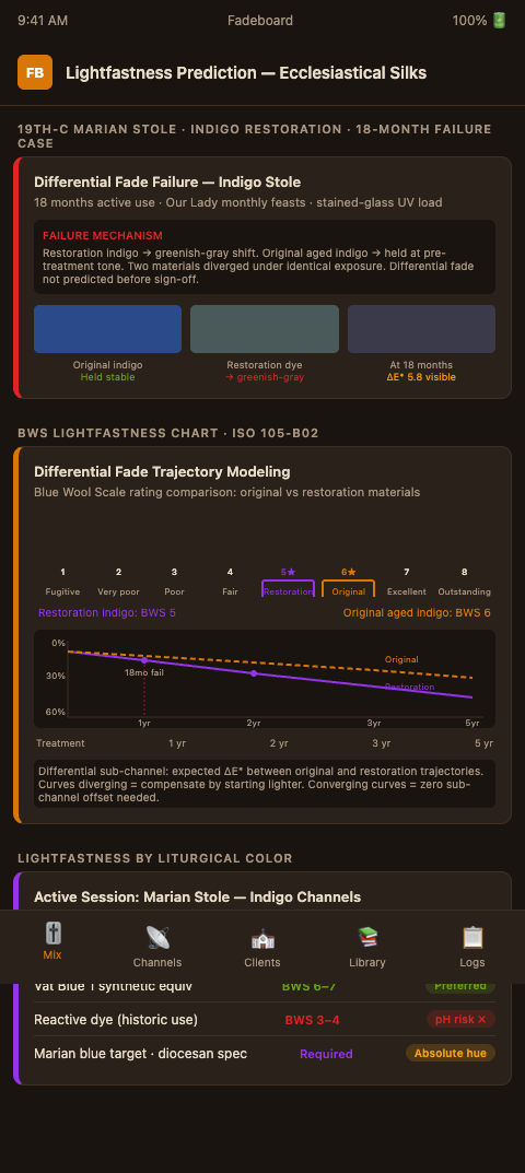 Fadeboard's channel architecture makes that prediction work explicit and recordable. If your studio treats silk vestments that will return to regular liturgical use, the lightfastness differential channel is one of the most valuable additions to your standard session configuration. Contact us to discuss how to integrate microfade testing data or accelerated aging results into your existing Fadeboard sessions.