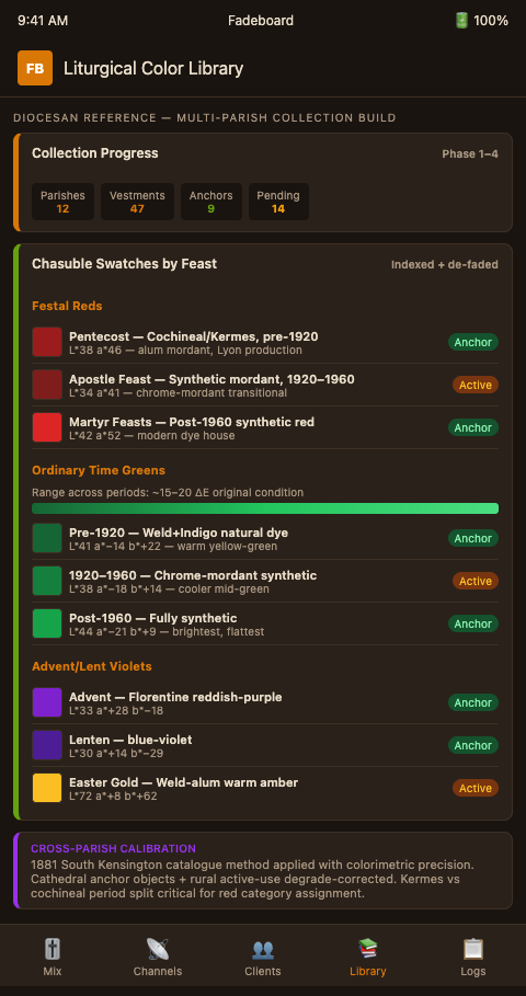 The liturgical color reference your diocese has never had can be started with the vestments in the sacristy today. A single afternoon documentation session with Fadeboard's intake workflow produces anchor-quality records for five to eight vestments, depending on garment complexity. Multiply that across three parishes and you have the beginning of a cross-parish calibration cluster.
