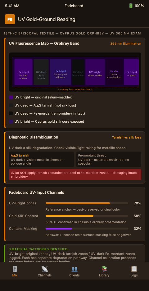 For a Pentecost-season orphrey in red silk ground with gold couching, the Fadeboard session should document UV-bright zones, UV-dark tarnish zones, and UV-dark iron-mordant zones as three distinct material categories before any channel calibration begins. Each category has a different degradation pathway and a different treatment implication.