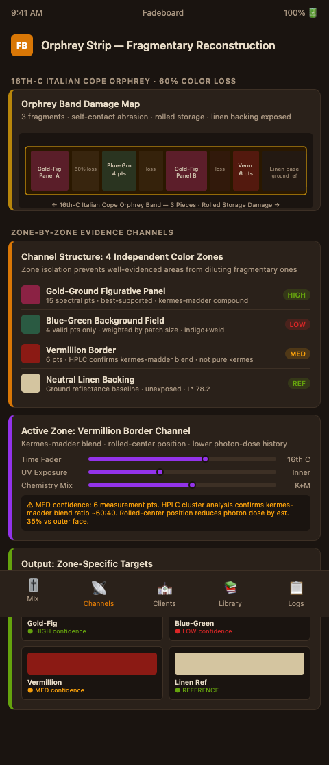 For your next fragmentary orphrey project, open Fadeboard with one channel per distinct color zone, weight your spectral baselines by measurement quality, and produce a confidence-rated output report before any fill material is dyed. The result will be a restoration that honors what the fragment actually shows, not a smooth average that obscures the archaeological record. Sign up for the Fadeboard waitlist and get started with a zone-mapping session on your current orphrey commission — the confidence-rating workflow is ready to use before your next Corpus Christi or All Saints institutional review deadline.
