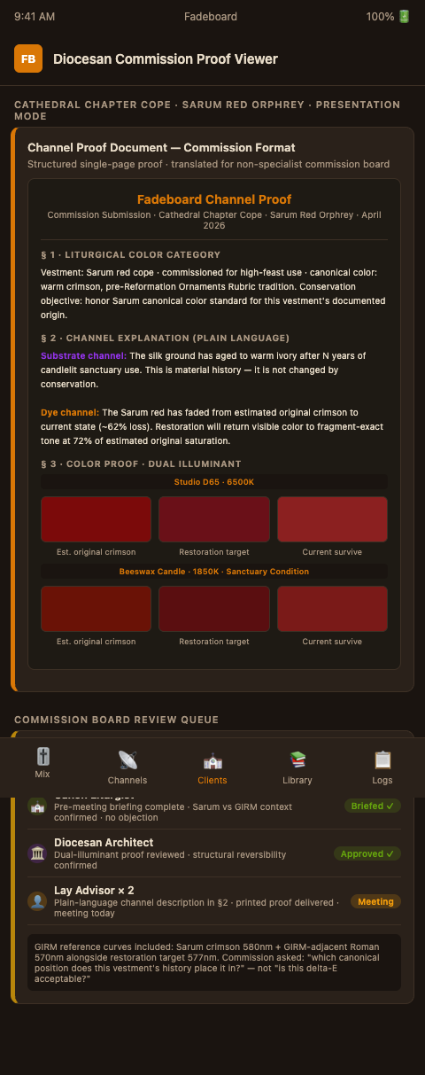 The Fadeboard proof for diocesan commission presentation is a structured single-page document derived directly from the session's channel configuration. It is not a raw spectrophotometric report. Its structure follows the commission's actual decision framework. For studios managing multiple simultaneous diocesan relationships, vestment studio soundboard pipeline expansion describes how proof generation integrates into a scaled workflow where multiple commissions are active in parallel.
