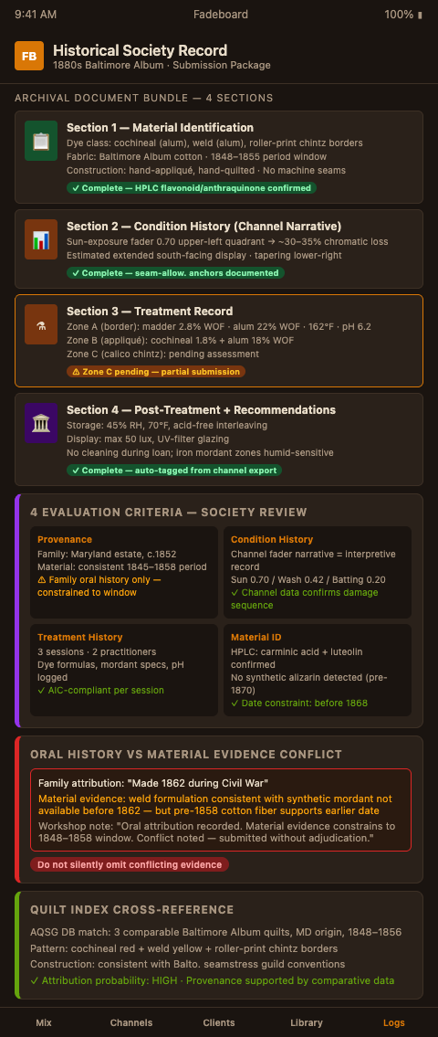 Section 3 — Treatment Record. The dye bath formulas, pre-treatment parameters, and mordant specifications from each zone, organized by zone identifier and cross-referenced to the condition history. AMNH Conservation Methodologies: Condition Reporting provides a framework for documentation components that historical societies use to evaluate submissions — the Fadeboard treatment record maps directly onto those components.