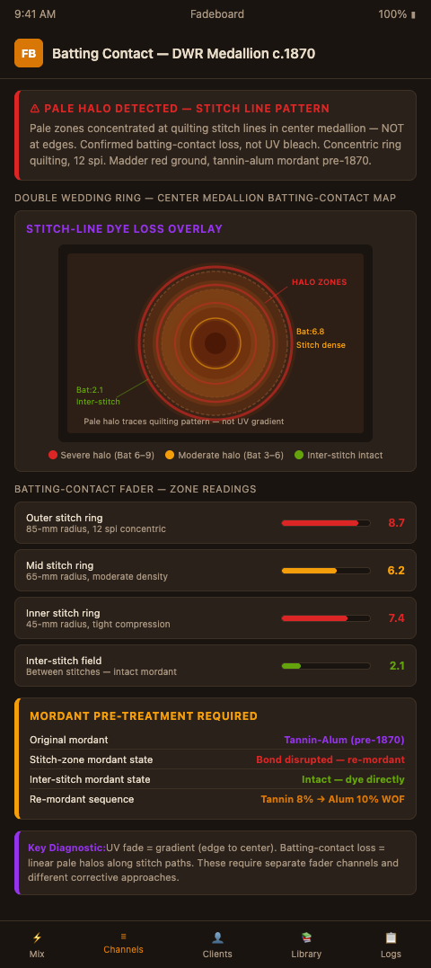 In Fadeboard's channel system, batting-contact loss gets its own independent fader — separate from the sun-exposure fader and the wash-cycle fader. This matters because the corrective dye concentration for a batting-contact zone is calibrated differently than for a UV-faded zone. UV-faded fabric still has its mordant structure largely intact; the chromophore has degraded but the fiber-mordant bond remains. You are adding dye back to a still-functional mordant platform. Batting-contact loss may have disrupted the mordant-fiber bond itself, which means you may need a mordant re-treatment before the dye will hold.