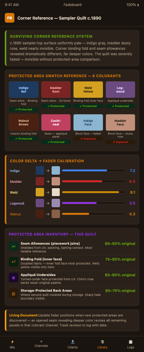The corner-reference document is the single most useful tool for an apprentice handoff on a multi-session quilt restoration. An apprentice who has not examined the original quilt can still mix accurate corrective baths if they have the reference photographs, the channel settings in Fadeboard, and the resulting bath recipes from previous sessions.
