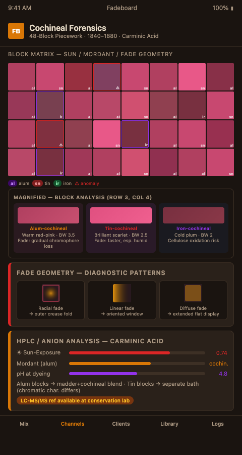 When you are ready to treat cochineal piecework quilts with the precision they require — block-by-block channel assessment, mordant-specific bath formulas, and a session file that captures every decision for future reference — Fadeboard's matrix view is the tool your forensics protocol needs. Visit the waitlist page to apply for access, and request a demo focused on piecework fade analysis — we will walk through a block matrix together using a cochineal quilt from your current intake.