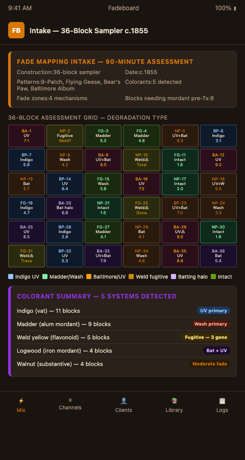 Get started with Fadeboard's structured intake templates by joining the waitlist — open to quilt workshops now. Bring any 19th-century multi-block sampler from your current intake, and the block-by-block fader setup will be the first thing we build together.