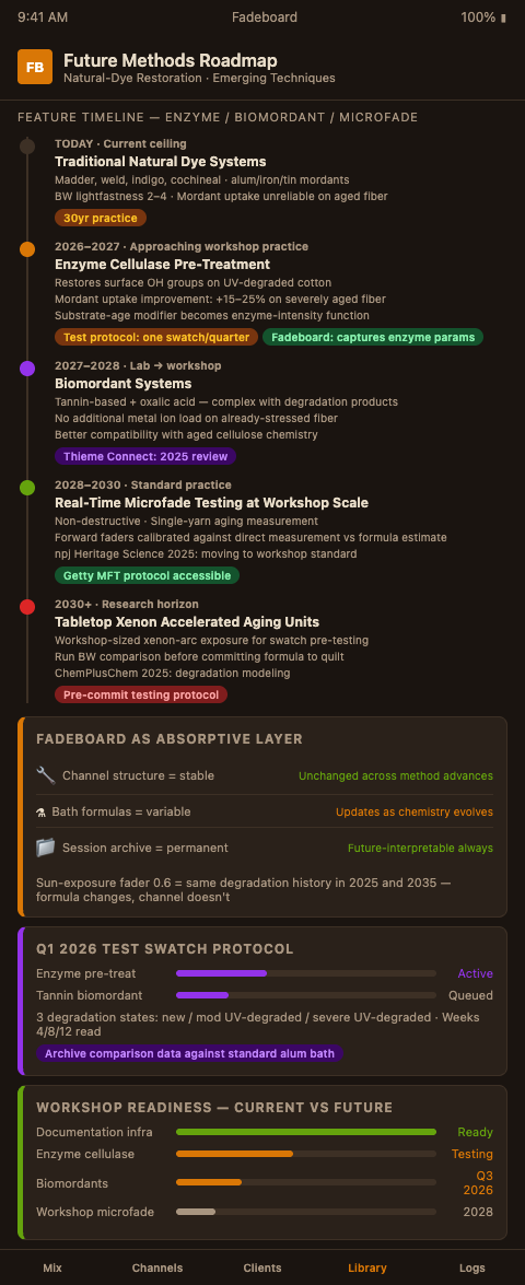 Enzyme cellulase pre-treatments for mordant site restoration. Research demonstrates that mild cellulase treatment can partially restore surface hydroxyl groups on UV-degraded cotton without significant fiber damage, improving mordant uptake on historic fiber by 15–25%. The practical implication for Fadeboard users is that the substrate-age modifier in the dye concentration calculation — currently applied as a flat discount for degraded fiber — could become a function of enzyme pre-treatment intensity, enabling more precise color depth targeting on severely aged cotton.