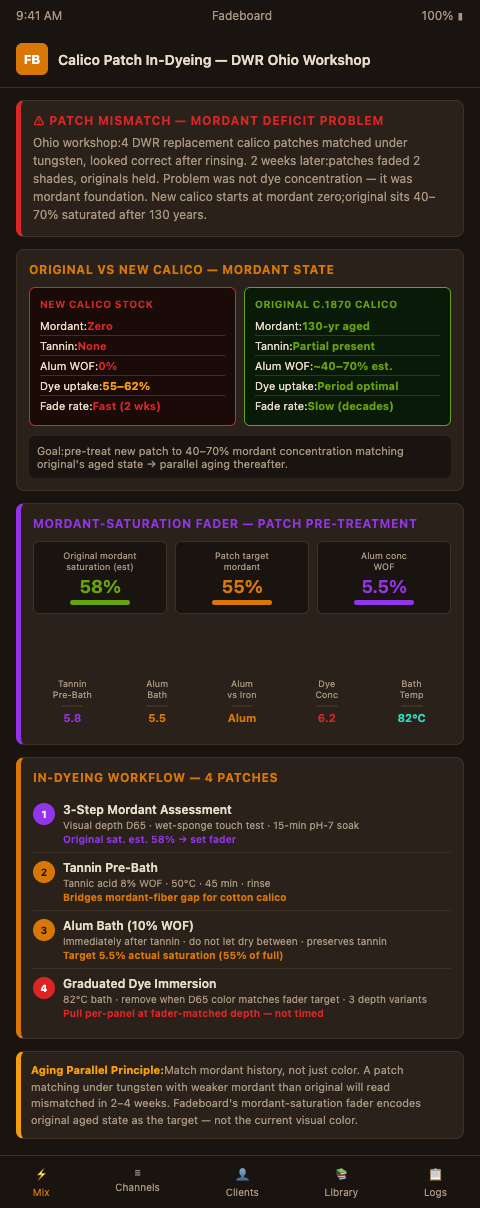 Fadeboard addresses this directly through its mordant-saturation fader. The operator assesses the original surrounding fabric — examining color depth under magnification, testing wash-fastness on a small hidden area, reviewing any available laundry history from the client — and sets a mordant-saturation fader position that represents how deeply the original was mordanted. The patch's mordant treatment is then targeted to match that fader position rather than being applied at a generic standard rate.