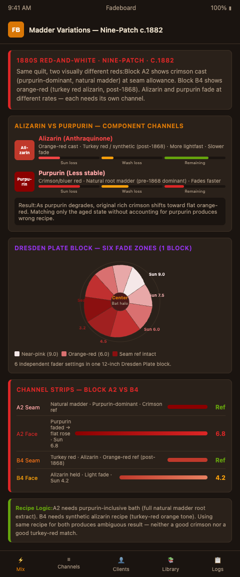 Workshops ready to treat alizarin, purpurin, and turkey red as separate fader channels — rather than a single "red" problem — can subscribe to the Fadeboard waitlist and start with a free intake session on a red-and-white quilt from your current project list. Bring the construction date, any mordant identification notes, and the seam-allowance references for each block type.