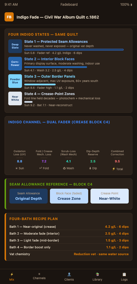 If your workshop is ready to move beyond single-bath indigo approximations and treat each block's degradation state as its own fader problem, sign up for the Fadeboard waitlist now. Bring your next Civil War-era piecework piece — include the block count, the estimated fold history, and any known laundering records — and we will walk through the crease-point fader calibration together.