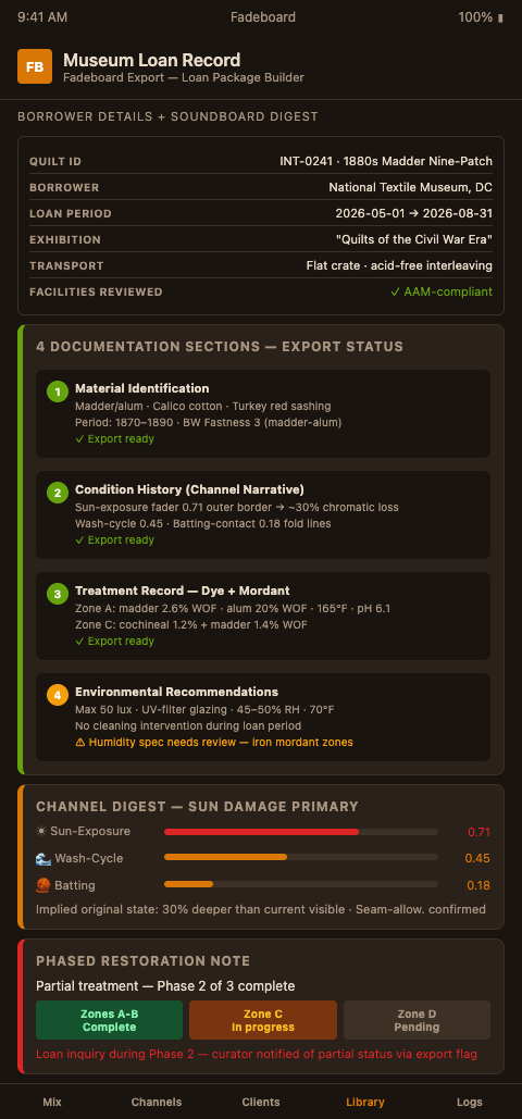 Fadeboard's channel-based damage record makes the environmental specification derivable rather than guessed. A quilt whose primary damage channel was sun-exposure, with a fader reading of 0.8 on the outer border panels, needed decades of high-UV exposure to reach its current degraded state. The loan package derived from that channel reading should specify a maximum display lux of 50 lux with UV-filtering glazing — because any lux level that replicates the original exposure conditions will accelerate degradation of both the original dye and the restoration dye at the same rate. Fadeboard records this recommendation as a tagged annotation in the session export, so it travels with the documentation automatically.