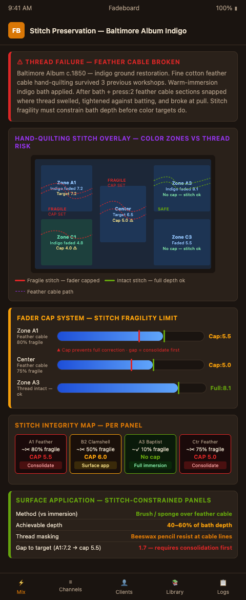 A quilt where the indigo ground has faded to pale blue but the feather cable is at 80% fragility will not receive a full indigo restoration in one pass. Fadeboard will show the color target, show the stitch-limited maximum, and show the gap — which is the work that requires stitch stabilization before color can proceed. That is not a limitation of the tool; it is the correct framing for conservation-grade quilt work.