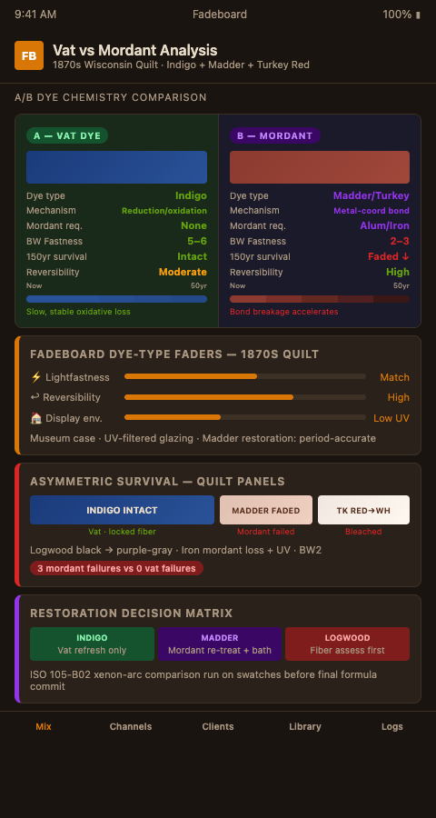 Mixed-chemistry quilts. Many 19th-century quilts contain both vat-dyed and mordant-dyed elements — indigo and madder were commonly used together, with the indigo applied first (as it requires no mordant and would be unaffected by a subsequent mordant bath). Vat dyes provide the highest colorfastness class; mordant dyes are more color-flexible but lower fastness. In a mixed-chemistry quilt, Fadeboard maintains separate fader columns for each dye type, since the restoration logic differs: the indigo panels may need only a reduction-oxidation vat refresh, while the madder panels need a full mordant re-treatment before the dye bath.