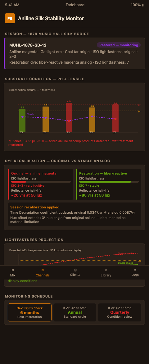 If your archive is restoring aniline-dyed silk bodices with chemically stable modern analogs and finding that your Fadeboard projections seem to over-predict future fade, join the Fadeboard waitlist and open a recalibration session for your current aniline restoration cohort. Update the session's dye-family assignment and recalibrate the Time Degradation coefficient to match your restoration material's ISO rating — the likely cause is a degradation rate coefficient carried over from the original compound's lightfastness data. The resulting projections will be more accurate, your monitoring schedule will be appropriately calibrated, and your loan documentation will reflect the restoration's actual stability rather than the original material's instability.