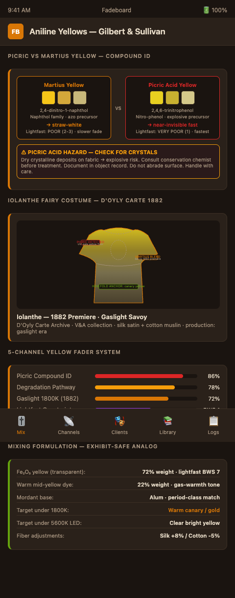 Theater archivists ready to translate gaslight-era yellow intent for modern LED rigs can join the Fadeboard waitlist and receive a guided compound-identification protocol calibrated to the specific aniline yellow families found in Savoy and D'Oyly Carte wardrobe. Apply now before your next touring production loads in.