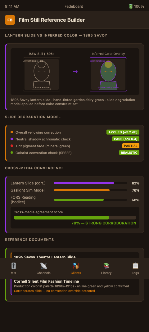 Once the slide degradation model is built, the corrected slide reading becomes the constraint layer in the Fadeboard garment session. It does not set the fader position directly — the slide is still an interpreted, corrected document rather than a direct measurement — but it defines a plausible range. If the gaslight-era garment simulation produces a color that falls within the range indicated by the corrected slide, the model gains corroboration. If the simulation falls outside that range, the discrepancy is flagged for investigation.