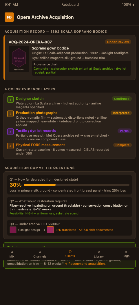 If your opera archive is submitting acquisition packages without color evidence sections, Fadeboard's acquisition session workflow gives you the structure to add that layer without requiring separate instrument investment for each submission. Run the session against the available provenance records and current-state measurements, generate the two-format output, and submit. Committees that have received these packages consistently report that the restoration scope estimate — the "what would it take" question answered quantitatively — is the single most valuable addition to their decision-making process.