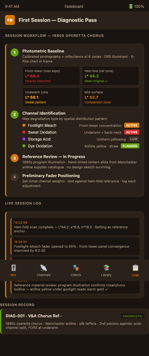 Build the session log as you go, not after. The AIC's Technical Studies Group standards for dye analysis in textile conservation specify that analytical sequencing and results should be recorded contemporaneously to prevent retrospective rationalization. (TSG Chapter V: Analysis and Testing Methods for Textiles — AIC Conservation Wiki) In a Fadeboard session, this means logging each fader change as you make it, with a brief note on the reasoning. The session log is a permanent archive record; a post-hoc reconstruction is not.