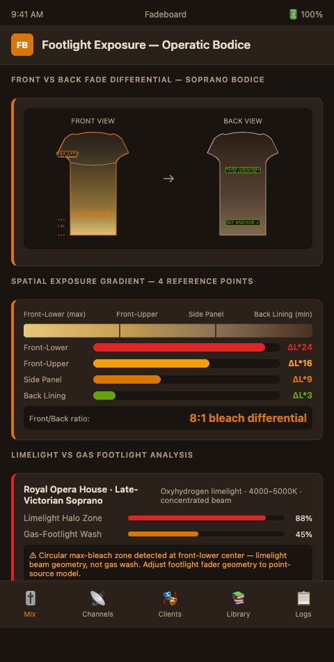 Think of the footlight trough as a directional audio source in a room: the surfaces facing it receive full-volume signal; surfaces perpendicular to it receive reduced signal; the back of the room receives almost none. An audio engineer applying room-correction in a recording does not apply the same gain to every microphone position — they correct each position for its specific relationship to the source. Fadeboard applies the same logic. The front-lower panel of a soprano bodice needs a different fader position than the shoulder seam, the side panel, or the back yoke, because each received a different dose of footlight exposure.