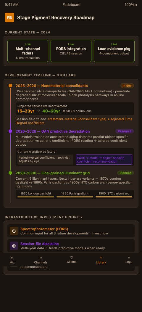 Fadeboard's session architecture will need to accommodate this development by adding a treatment-material field that records not just the dye analog used but the consolidation system applied, and adjusts the Time Degradation fader coefficient accordingly. A session that records "fiber-reactive magenta analog plus UV-absorber silica nanoparticle treatment" should project a substantially different degradation curve than one using a dye analog alone.
