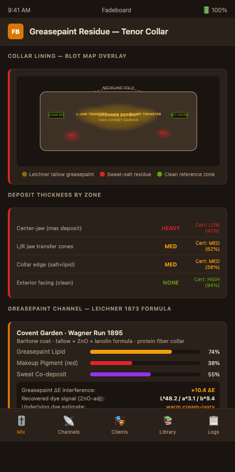 If your archive holds tenor, baritone, or character costumes with significant collar contamination from active performance runs, Fadeboard can build the greasepaint channel model before any physical treatment is decided.