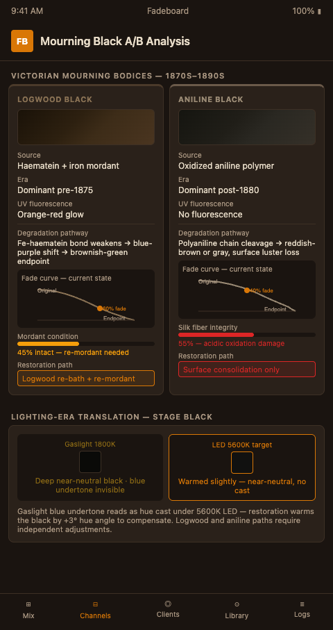 Theater archivists managing mourning costume lots should begin every new lot with the chemistry identification channel before any other treatment planning. The logwood-aniline distinction is the single most consequential variable in a mourning black restoration — and it is one that cannot be determined by eye, regardless of how experienced the conservator. Committing half an hour to UV fluorescence and spot testing at the start of the lot saves hours of incorrect treatment and potential irreversible harm to the most visually and historically significant pieces in the mourning wardrobe collection.