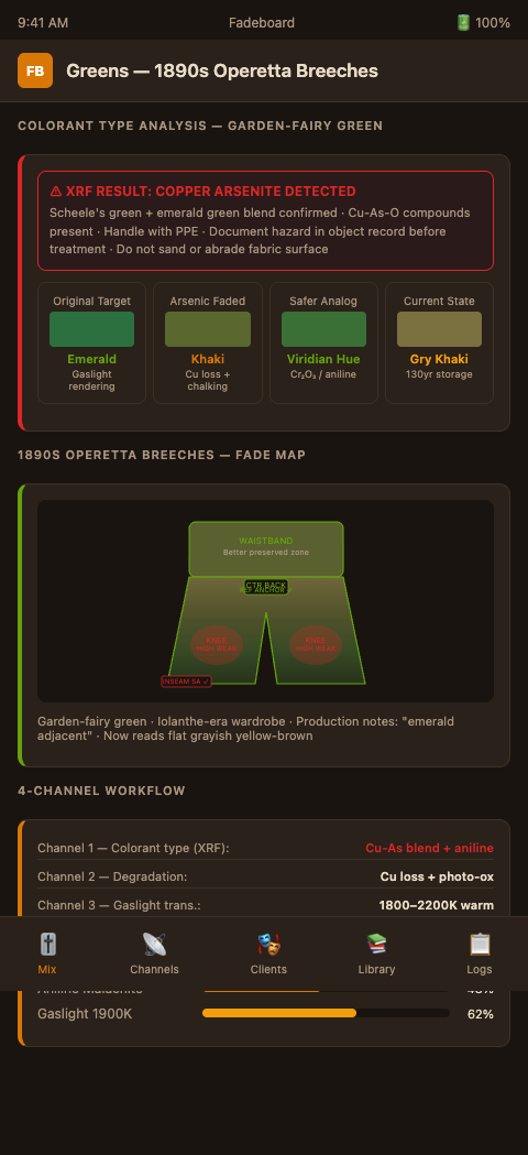 Channel 2 — Degradation mechanism. Arsenic greens fail through copper loss and surface chalking. Aniline greens fail through photo-oxidation of the chromophore. Mordant-based natural greens (over-dyed blue indigo + yellow weld) fail through differential bleaching of the indigo component, leaving a yellow residue. Each mechanism produces a different color endpoint, and each requires a different restoration path. Setting this fader correctly means the difference between a breeches leg that restores to a period emerald and one that restores to a muddy blue-green.