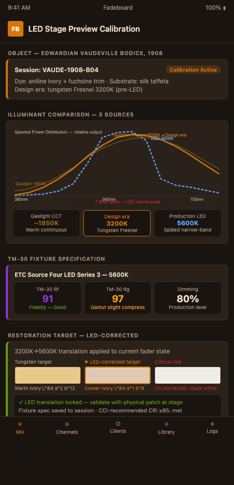 For a theater archive preparing costumes for a remount under contemporary LED fixtures, the calibration question is: what does the correct restoration target look like under this specific LED source, and how do I configure Fadeboard to generate that target?