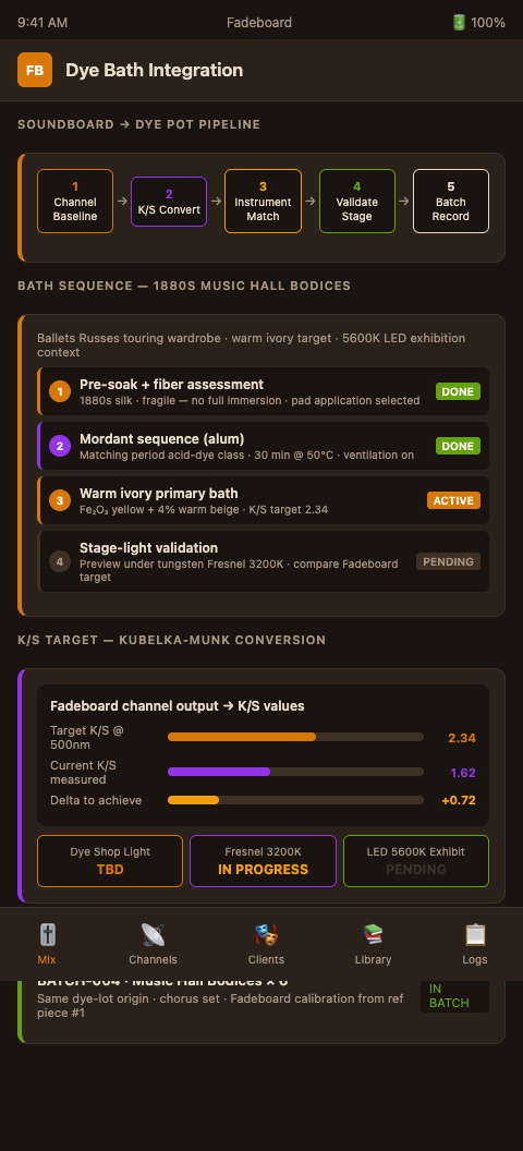Step 4 — Validate under the correct light source before committing. Once a test patch is dyed, it should be evaluated not under the dye shop lighting but under the intended display or performance light source. For a touring company remount, that means a tungsten Fresnel or LED rig that matches the production spec. For an exhibition, that means the exhibit case lighting conditions. The Fadeboard session remains open through this step — if the test patch falls outside the target range, the relevant fader channel is adjusted and the formulation is revised before the full batch runs.